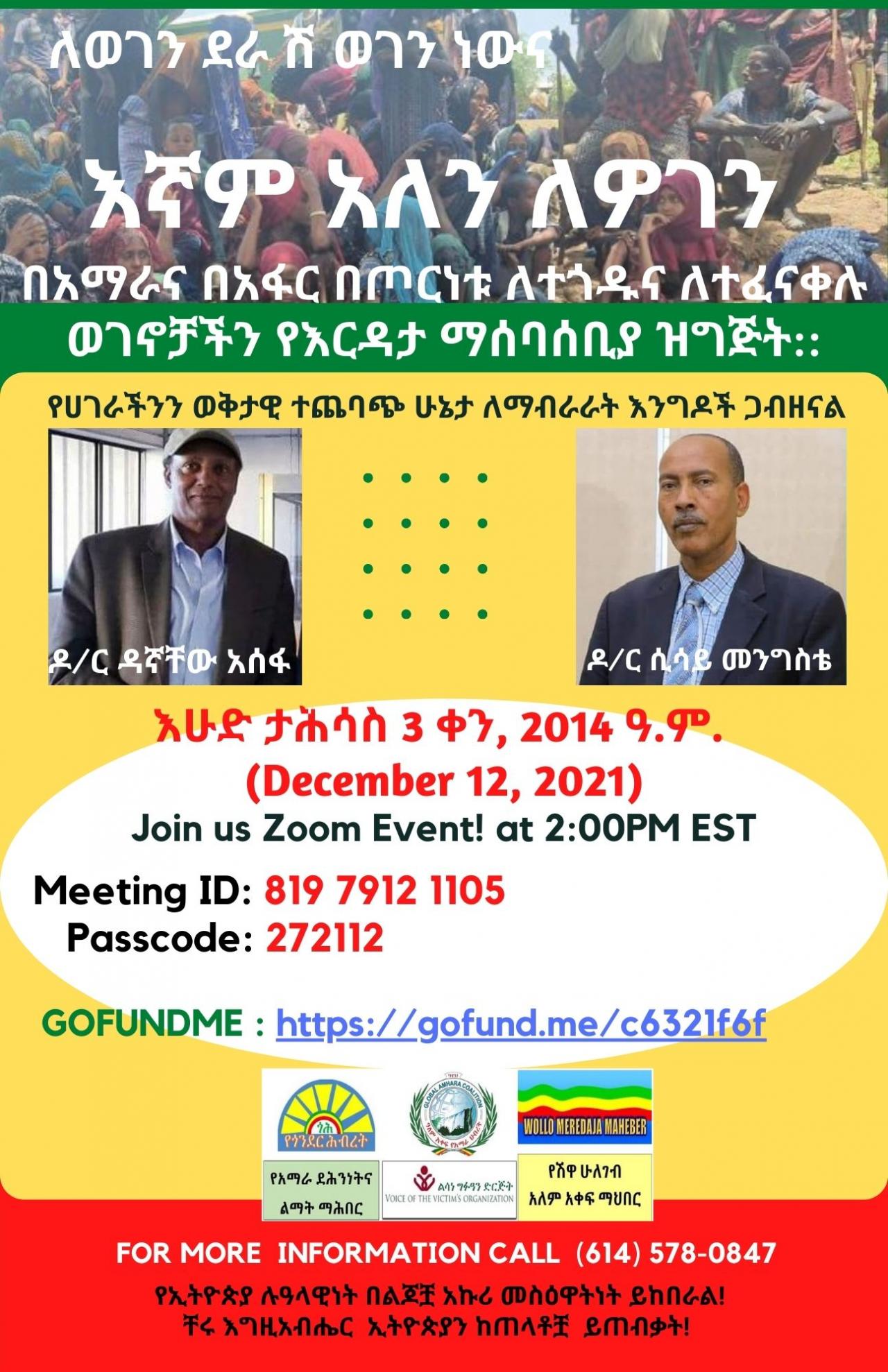 GoFundMe Link: Fundraiser set up by the 6 organizations mentioned below : በአማራ እና በአፋር ለተጎዱና ለተፈናቀሉ ወገኖች የእርዳታ ማሰባሰቢያ ዝግጅት (gofundme.com)