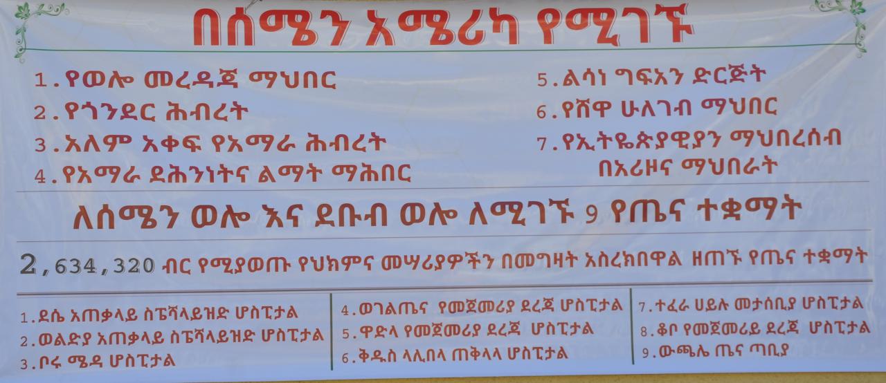 As we provided you with the video and pictorial reports of your donation in action where nine (9) hospitals were helped in Wollo (Ethiopia). As they told us, these 7 groups were the first to get to their immediate needs and helped them to treat patients and served their community. You and your family and friends should feel proud for what you did for our people. It does not mean that this support is enough to overcome their problems and issues, however, it’s a start and a continues journey and we will be asked to reach our pocket and pocket book and extend our hand again. Those hospital items have been purchased and delivered fully. However, due to various constraints, the report was delayed and we apologized. Nevertheless, once again, thank you for your support and we couldn’t have done it without your generosity.